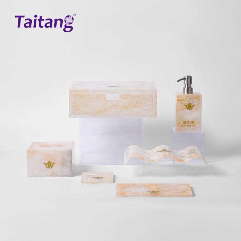 This Taitang Hotel Bathroom Storage Collection, uses acrylic as its material, integrates the fluid elegance and warm texture of natural minerals into everyday bathroom life. The interwoven patterns of soft gold and warm white create a gentle, light-filtering effect, breaking the monotony of traditional bathroom accessories and turning storage into an aesthetic focal point in the space.